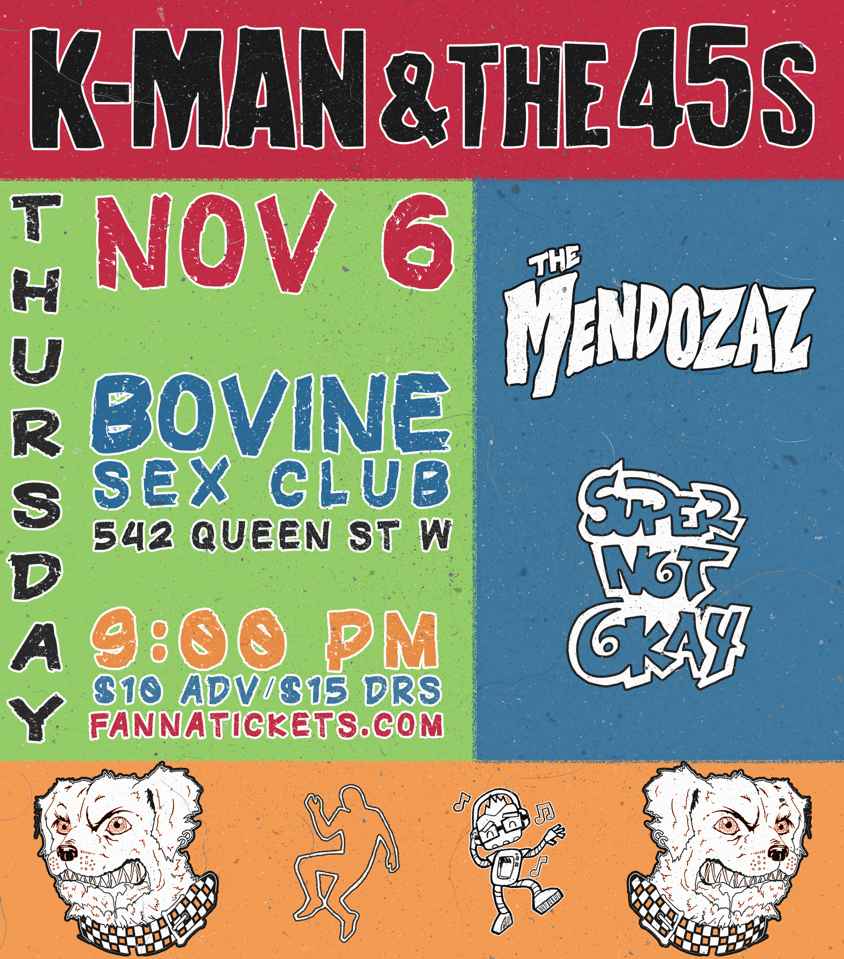 NOV 6 - K-MAN & the 45's, THE MENDOZAZ and SUPER NOT OKAY at Bovine Sex Club (Toronto
